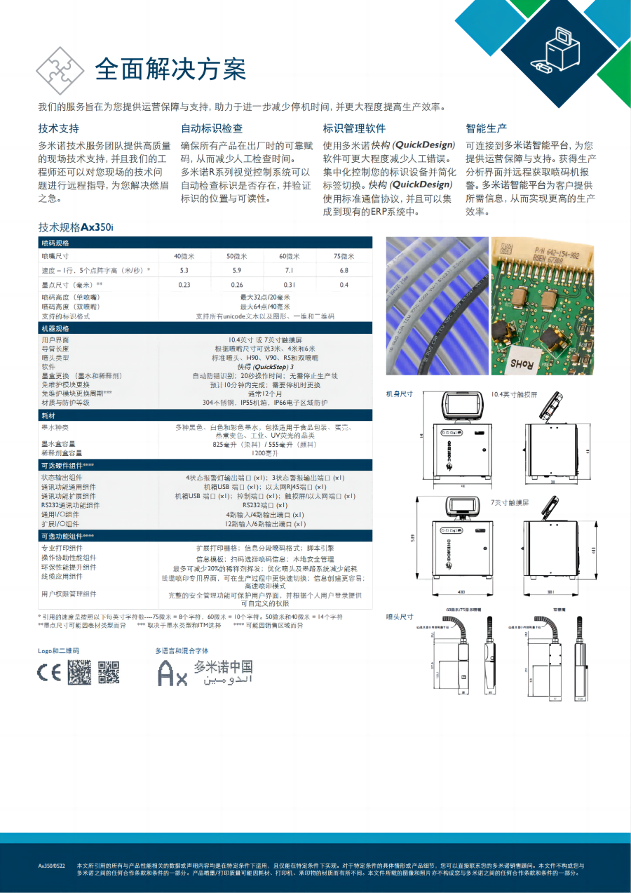 为了顺利集成至您的生产线,Ax系列产品支持主要的行业通信协议,简化了安装和在线自动化流程。Ax系列喷码机能够集成至联网打印系统,集中提供打印格式实现无差错喷码,并能与ERP等企业现有的业务系统相兼容